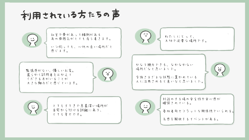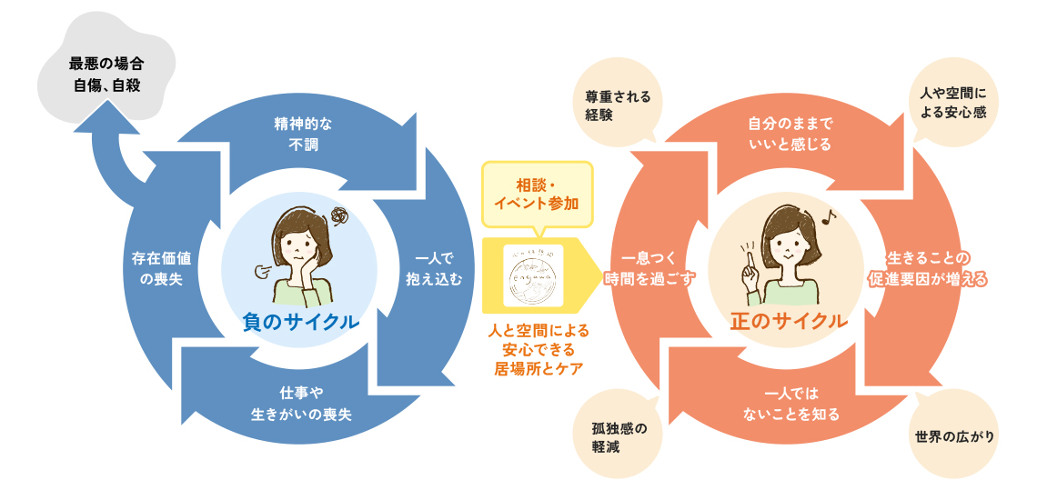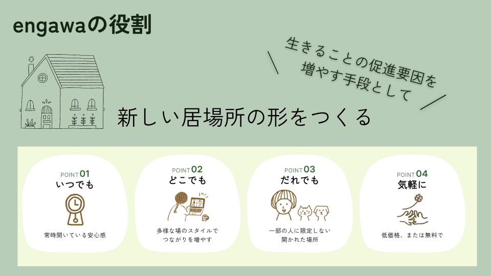 engawaは、楽しい、心地いい、大切にされている、と言った「生きている実感」を持てるような空間や人との関わりを増やしていくことで「生きることの促進要因」を増やし、